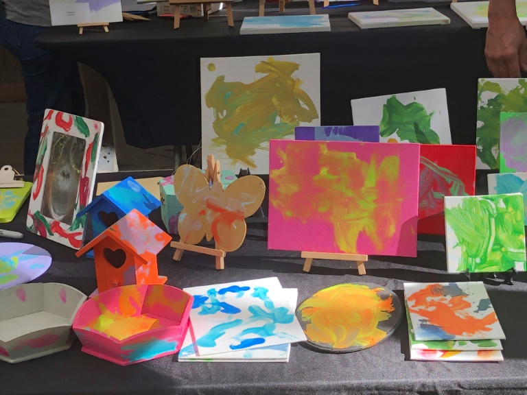 Sur des tables, au beau milieu des arbres, les organisateurs ont disposé les peintures abstraites et multicolores réalisées par les animaux.