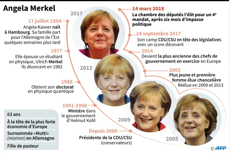 Angela Merkel a été réélue mercredi matin chancelière d'Allemagne, un quatrième mandat qu'elle entame affaiblie et avec six mois de retard face aux défis du populisme et de la réforme de l'Union européenne.