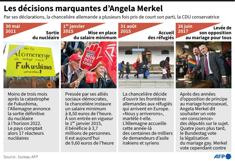 En 2011, c'est la catastrophe nucléaire de Fukushima qui l'avait convaincue en quelques jours d'enclencher le retrait progressif de l'Allemagne de l'énergie nucléaire. Mais sa prise de risque historique intervient à l'automne 2015, lorsque Angela Merkel décide d'ouvrir son pays à des centaines de milliers de demandeurs d'asile syriens et irakiens. Malgré les inquiétudes de l'opinion, elle promet de les intégrer et de les protéger. "Nous y arriverons!", assure-t-elle. Peut-être la phrase la plus marquante prononcée au pouvoir par Mme Merkel, rétive aux discours enflammés.