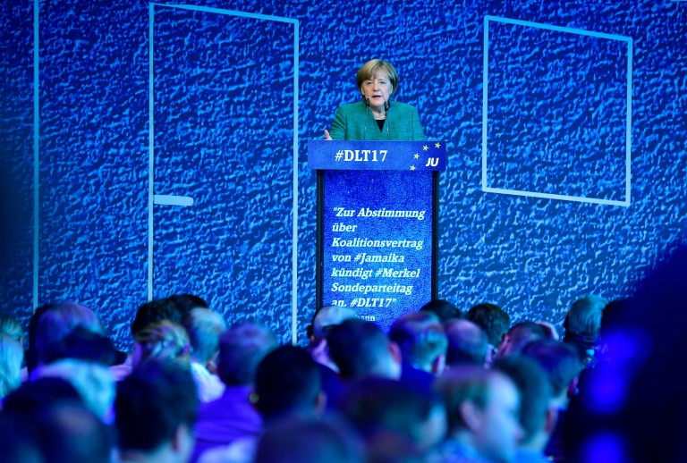 A côté d'applaudissements nourris, elle avait été également accueillie avec quelques panneaux de délégués des jeunes de la CDU exigeant vouloir "limiter l'immigration".