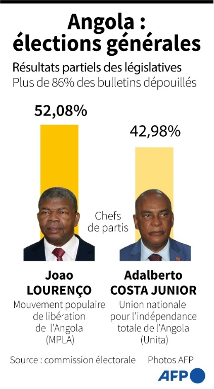 Le président angolais sortant, Joao Lourenço, se rapprochait jeudi soir de la victoire face à son charismatique rival de l'opposition, selon des résultats officiels comptabilisant la quasi totalité des votes exprimés lors d'élections législatives disputées.