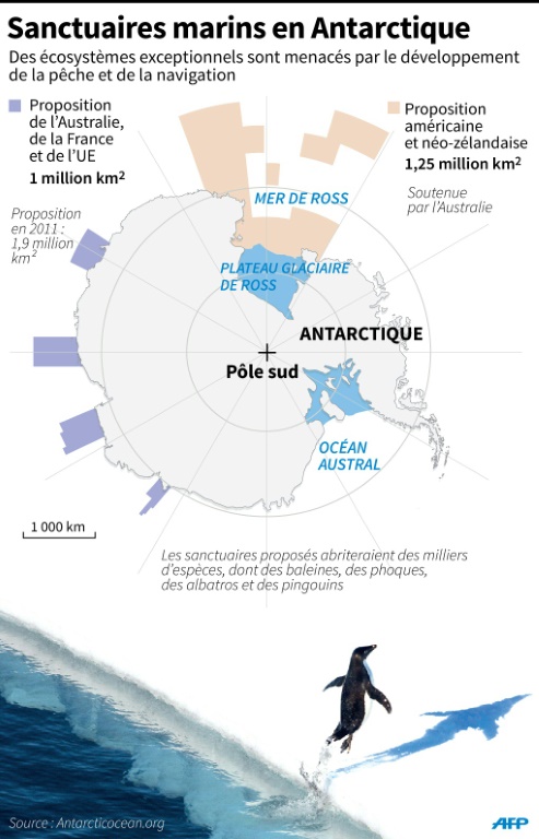 La Commission pour la conservation de la faune et la flore marines de l'Antarctique (CCAMLR), établie en 1982 par une convention internationale, achoppe depuis 2011 sur deux projets de gigantesques aires marines protégées (AMP).
