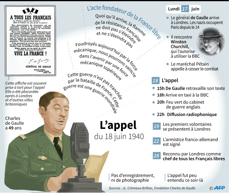 Au lendemain de son arrivée à Londres le 17 juin 1940, de Gaulle avait appelé les militaires, ingénieurs et ouvriers français à le rejoindre pour poursuivre la lutte contre l'Allemagne nazie, malgré l'armistice demandé par le maréchal Pétain. "Quoi qu'il arrive, la flamme de la résistance française ne doit pas s'éteindre et ne s'éteindra pas", avait-il déclaré en concluant sa célèbre intervention.