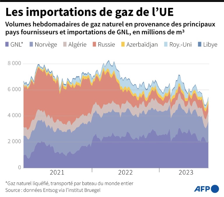 Investissant dans des terminaux d'importations portuaires, les Etats ont compensĂ© en gonflant de 70% en 2022 leurs achats de GNL, transportĂ© par navires et venu Ă plus de 40% des Ătats-Unis mais aussi de Russie (17% des achats europĂ©ens entre janvier et juillet 2023).