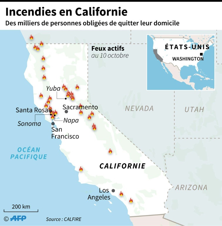 L'incendie baptisé "Tubbs", qui sévit près de la ville de Santa Rosa, en tuant à lui seul onze personnes, est devenu le sixième plus mortel de l'histoire de la Californie. Il a brûlé entre dimanche soir et mercredi matin plus de 11.000 hectares et détruit plus de 570 bâtiments, dont 550 résidentiels. Environ 16.000 structures sont toujours menacées. Le président américain Donald Trump a déclaré mardi l'état de catastrophe naturelle.