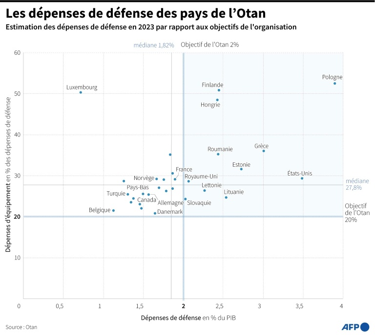Si seuls 11 pays sur 31 avaient atteint l'objectif de 2% de leur PIB en dépenses militaires en 2023, ce chiffre devait être proche de 20 en 2024, a appris l'AFP de source proche de l'Alliance.