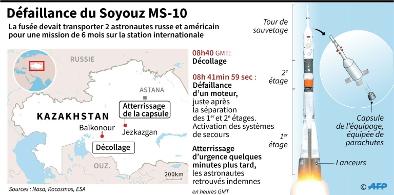 L'astronaute Nick Hague et le cosmonaute Alexeï Ovtchinine ont dû activer la procédure d'urgence pour détacher leur capsule de la fusée, deux minutes environ après le décollage, et revenir sur Terre, leur chute étant ralentie par des parachutes. Ils sont sains et saufs.