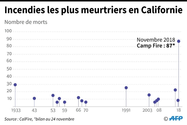 Les pompiers ont annoncé dimanche être venus à bout de ce feu qui a brûlé quelque 620 km2 dans le nord du "Golden State", rasant notamment la petite ville de Paradise. Dressant un nouveau bilan samedi soir, les autorités locales ont fait état de la mort de 87 personnes, dont seules 54 ont pour le moment été identifiées.