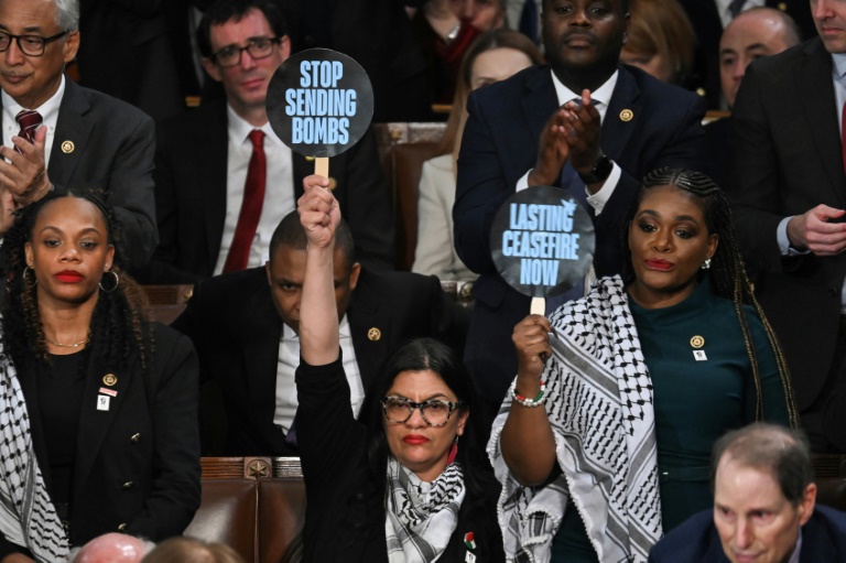 Pendant son discours, Joe Biden a également évoqué la guerre à Gaza, qui provoque la fureur de l'aile très à gauche de son parti ainsi que chez la communauté arabe-américaine, très critiques de son soutien à Israël.