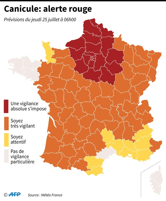 Vingt départements allant du Nord à l'Ile-de-France sont en alerte rouge canicule, et 60 autres en vigilance orange, la chaleur n'épargnant que la pointe de la Bretagne et la Méditerranée. Alors que le seuil des 40°C n'était dépassé en France que de façon très exceptionnelle il n'y a que 50 ans, "on attend généralement plus de 40°C, avec des températures qui pourront ponctuellement atteindre les 43°C entre le nord de la Bourgogne et le sud de l'Ile-de-France", a précisé à l'AFP le prévisionniste de Météo France Olivier Proust.