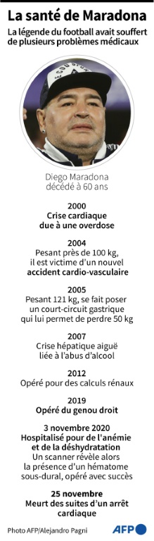 Contacté par l'AFP, son médecin n'a pas encore répondu. Le champion du monde 1986 était apparu très affaibli le 30 octobre, date de sa dernière apparition, le jour de son 60e anniversaire, pour diriger l'entraînement de ses joueurs du club de Gimnasia y Esgrima La Plata.