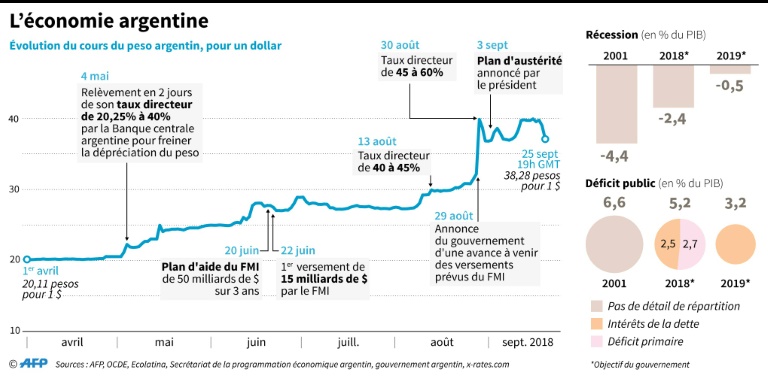 Confronté à une crise économique, le gouvernement du président de centre-droit Mauricio Macri a obtenu un prêt de 57 milliards de dollars du Fonds monétaire international pour tenter de stabiliser la 3e économie d'Amérique latine, dont la monnaie s'est effondrée de 50% face au dollar depuis le début de l'année.