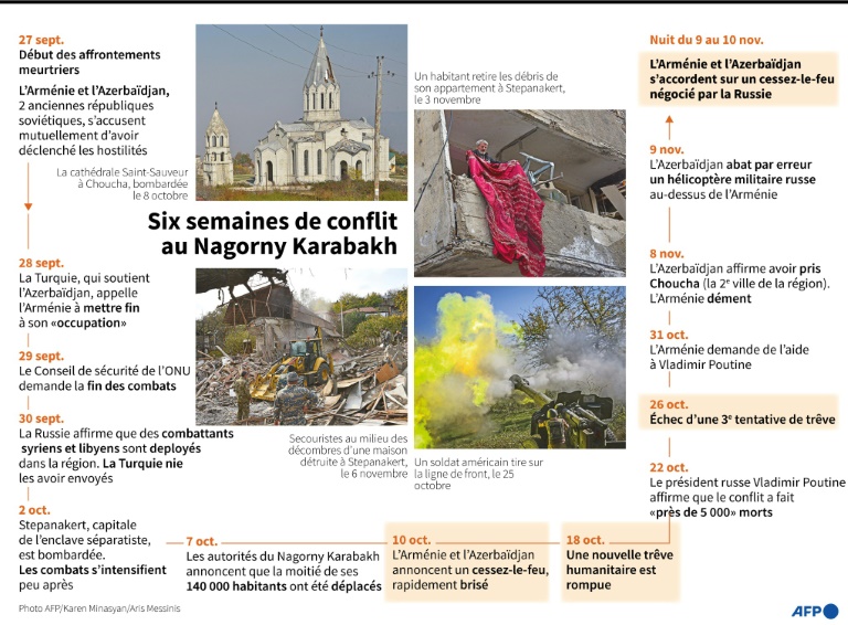 AprÚs six semaines de combats meurtriers pour la région indépendantiste du Nagorny Karabakh, l'Arménie et l'Azerbaïdjan ont signé mardi un accord de fin des hostilités sous l'égide de Moscou, les forces arméniennes étant au bord de la débùcle.