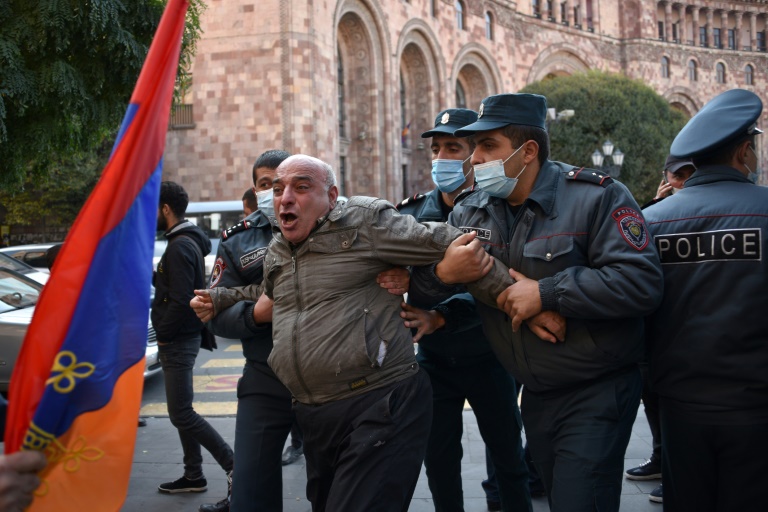 "Ils sont complices des Turcs, ne les soutenez pas", a lancé Arthur Vanetsian, un ancien chef des services de renseignements, en référence à la Turquie, ennemi ancestral et allié de l'Azerbaïdjan.
