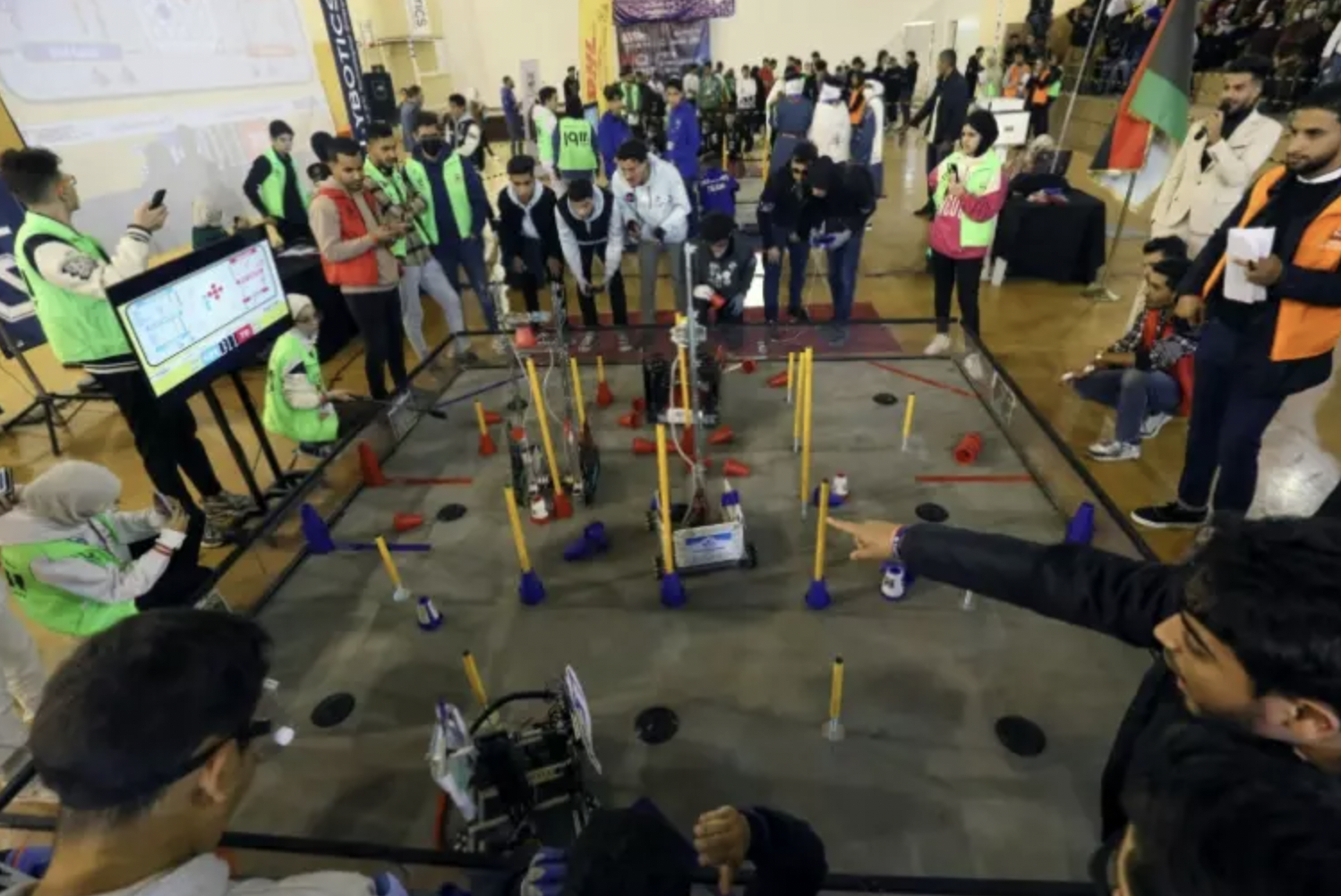 Devant le gymnase, une vingtaine d'équipes présentent leurs robots. Leur composition illustre aussi une volonté d'intégrer, dans une société très conservatrice, des groupes souvent marginalisés comme les femmes, les immigrés ou les personnes handicapées.