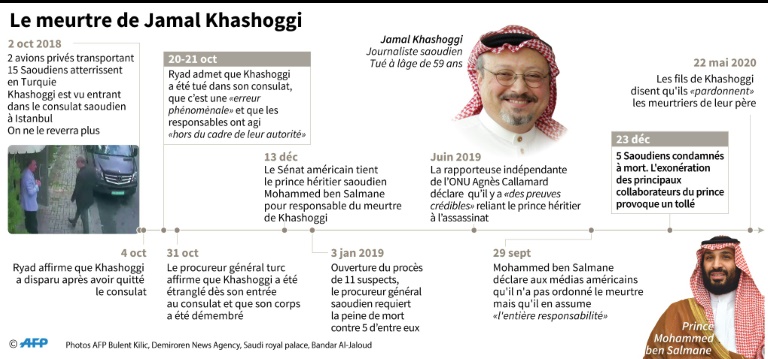 Khashoggi était âgé de 59 ans au moment de sa mort. Ses restes n'ont jamais été retrouvés. Ce meurtre a plongé l'Arabie Saoudite dans l'une de ses pires crises diplomatiques et terni l'image du prince héritier Mohammed ben Salmane, dit "MBS", désigné par des responsables turcs et américains comme le commanditaire du meurtre.