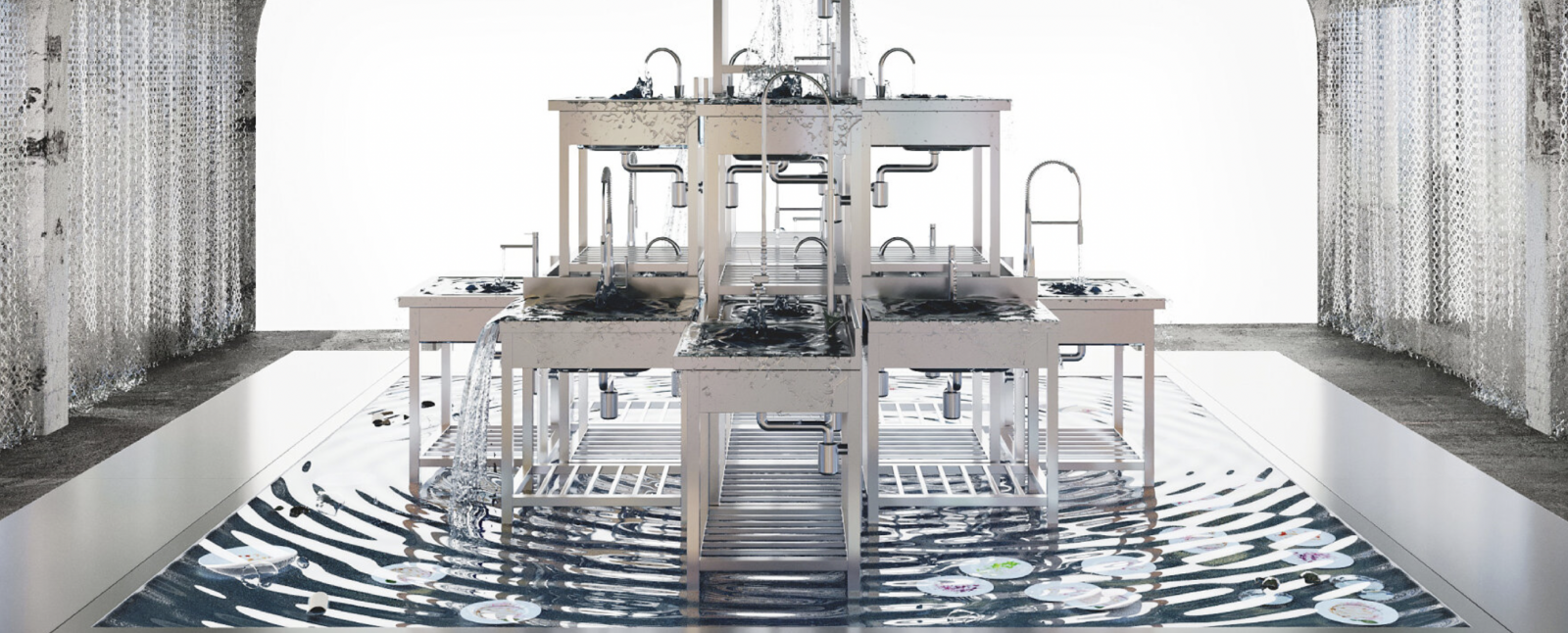 La pièce maîtresse, au milieu de la table, ressemblait à une fontaine/lave-vaisselle, avec des éviers empilés, des robinets ouverts et une piscine sur laquelle flottaient des assiettes sales.