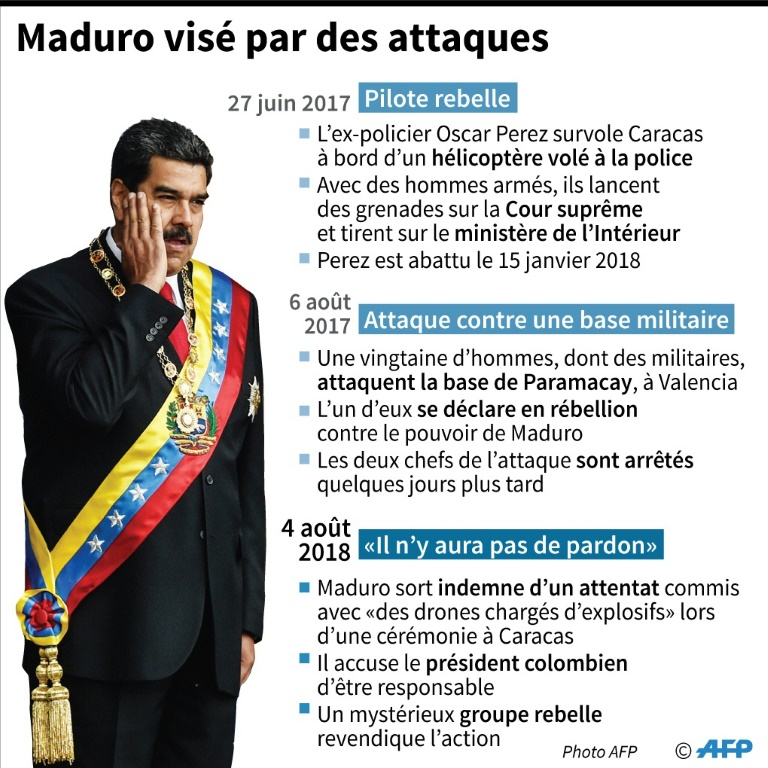 Peu après les faits, M. Maduro a mis en cause son homologue colombien, qui passe mardi les rênes du pouvoir à son successeur Ivan Duque. Evoquant des "financiers" non identifiés qui résideraient aux Etats-Unis, il a également mis en cause "l'ultra-droite", se référant ainsi à l'opposition vénézuélienne.