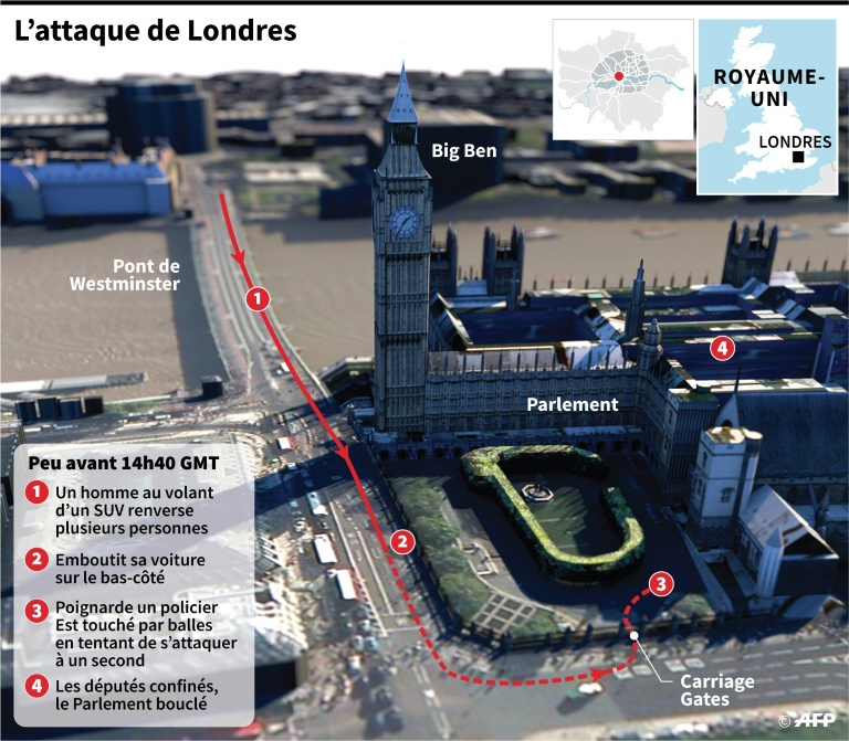 L'homme, né au Royaume-Uni et connu des services de sécurité selon la Première ministre Theresa May, a ensuite poignardé à mort un policier dans la cour du Parlement, symbole de la démocratie britannique, avant d'être abattu par la police.