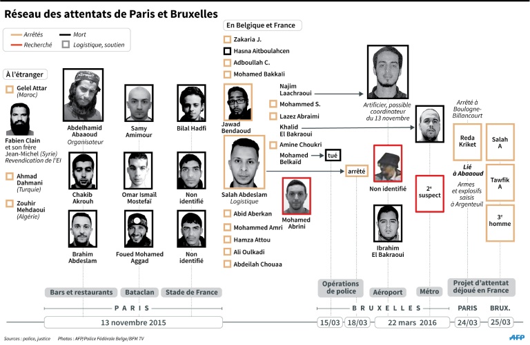 Une arrestation en Italie et une nouvelle inculpation en Belgique sont venues illustrer encore une fois l'imbrication des réseaux jihadistes français et belges, qui a éclaté au grand jour avec les attaques qui ont fait 130 morts le 13 novembre à Paris et 28 mardi à Bruxelles, selon un bilan révisé.