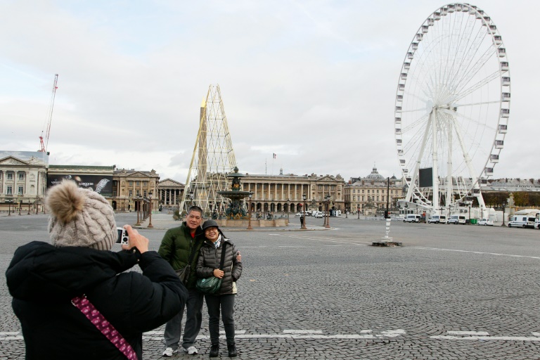 Des touristes prennent la pose devant la place de la Concorde à Paris le 30 novembre 2015