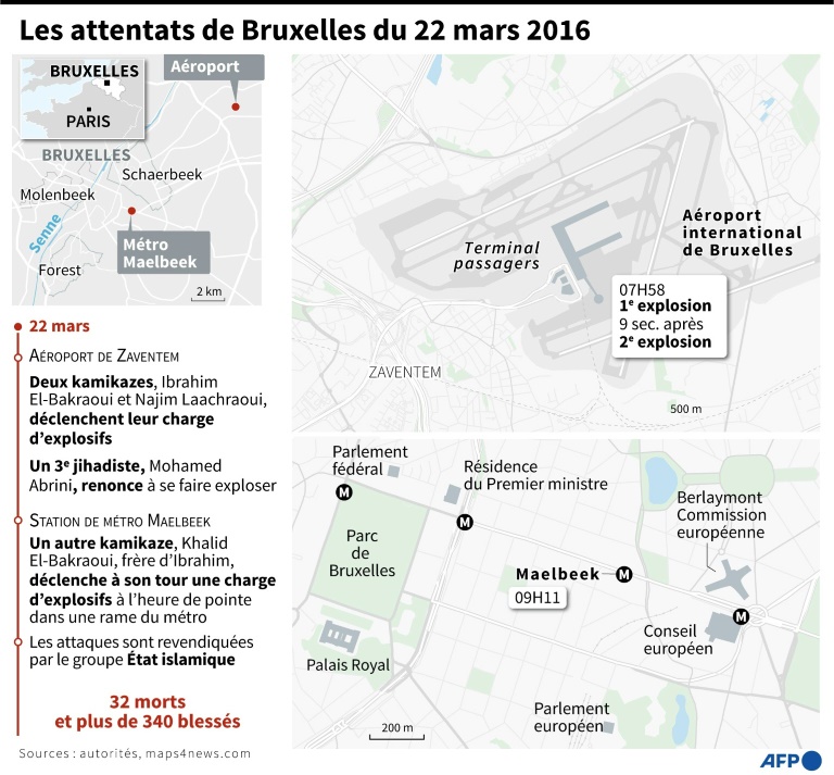 Au matin du 22 mars 2016, deux jihadistes s'étaient fait exploser à l'aéroport international de Bruxelles-Zaventem, et un troisième une grosse heure plus tard dans le métro de la capitale européenne. Bilan: 32 morts et plus de 340 blessés.