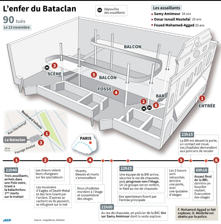 Au Bataclan, oĂč 90 personnes sont mortes, les jihadistes sont entrĂ©s Ă 21H42 - selon un SMS envoyĂ© par l'un d'eux vers la Belgique -, un commissaire de la Brigade anticriminalitĂ© (BAC) entre Ă 22H00 et tire sur un des kamikazes, dont le gilet explose. La BRI (Brigade de recherche et d'intervention) arrive Ă 22H15, rapidement suivie du Raid, autre corps d'Ă©lite de la police. L'assaut final est donnĂ© Ă 00H18, selon les enquĂȘteurs.