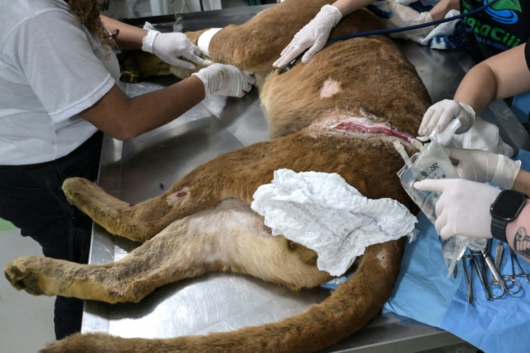 La chair à vif après avoir souffert une profonde entaille à la hanche, un puma, anesthésié sur un brancard, se fait soigner par des vétérinaires de l'association brésilienne Mata Ciliar.