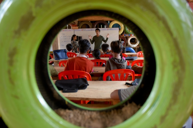 Des déchets plastiques en guise de frais d'inscription: au sommet d'une montagne dans un luxuriant parc national, une petite école a été édifiée à partir de pneus, de bouteilles et d'emballages que les élèves collectent pour pouvoir étudier.