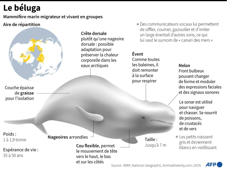 Les nouveau-nés, qui mesurent 1,80 mètre et pèsent 80 kg, restent dépendants de leur mère pendant deux ans. A l'âge adulte, ce mammifère, qui évolue généralement dans les eaux glacées autour du Groenland et au nord du Canada, de la Norvège et de la Russie, peut atteindre une taille de six mètres et vit entre 40 et 60 ans.