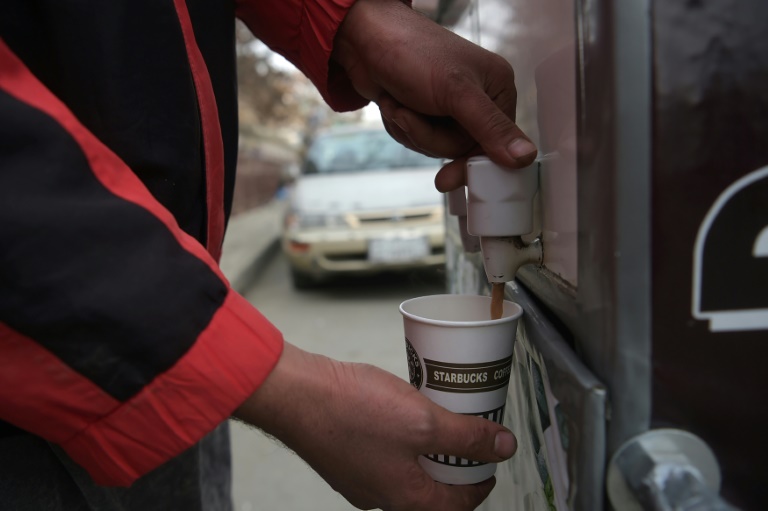 Najibullah Sharyari a installé ses chariots métalliques au milieu du chaos de Kaboul, entre vendeurs de rues et murs anti-explosion, pour les Afghans en quête de caféine et d'une alternative au sacro-saint "tchaï" (thé).