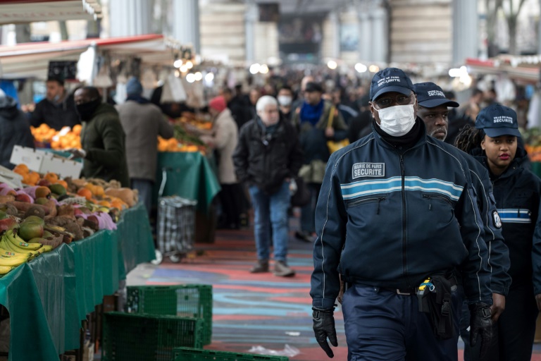 Au marché parisien de Barbès, moins grouillant qu'à l'accoutumée à l'heure du confinement, les policiers peinaient à faire respecter la "distance sociale" pour freiner le coronavirus.