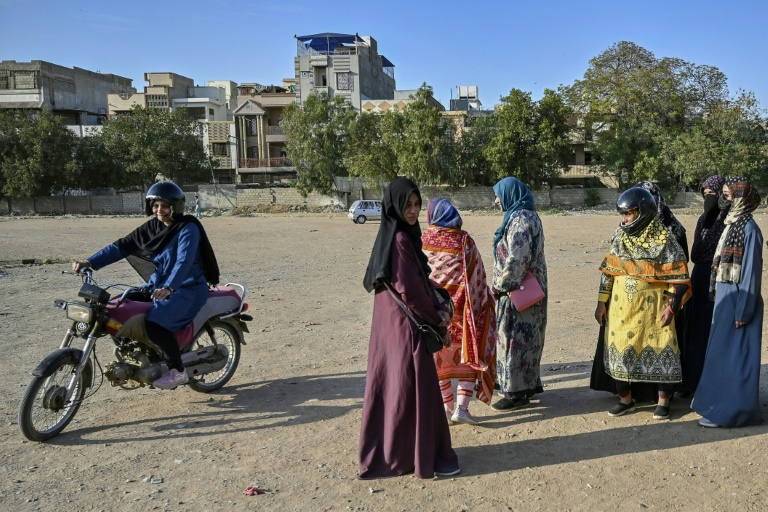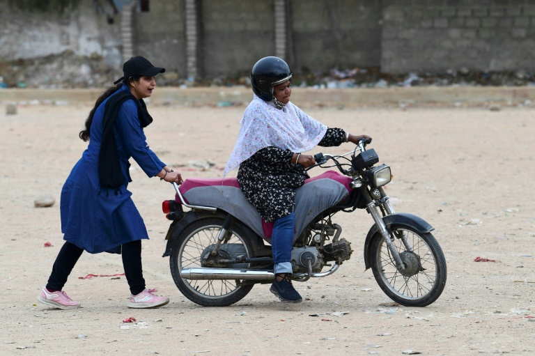 Sur un terrain poussiéreux de Karachi, la plus grande ville du Pakistan, des femmes aux voiles colorés, enserrés par un casque, apprennent à slalomer entre des plots au guidon de motos de petite cylindrée.