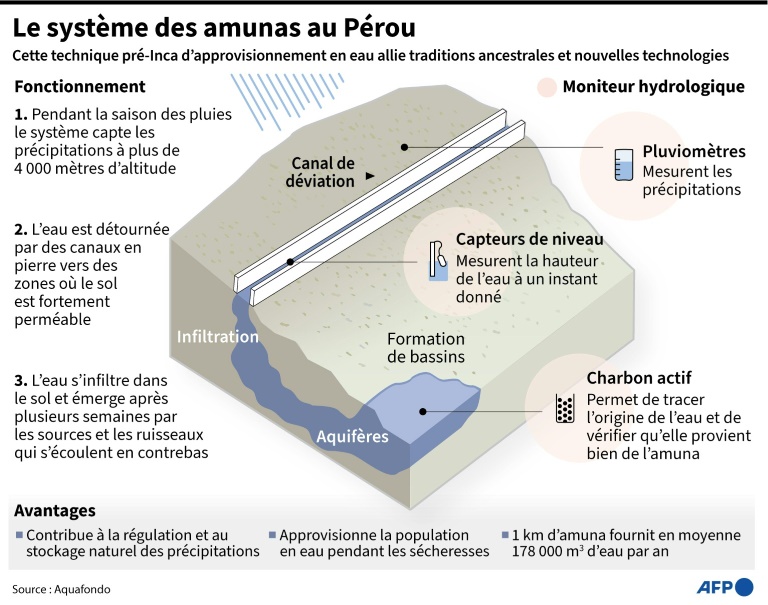 Il y a aussi l'urgence climatique. Lima, qui compte 10 millions d'habitants, est installée dans une zone désertique et ne détient que 2% des ressources en eau du pays. La capitale est ainsi soumise à de forts risques hydriques. Les amunas sont "importantes" pour faire face à ces risques, alors que les trois fleuves -- Rimac, Lurin et Chillon -- qui alimentent la capitale sont "assez dégradés", souligne Mariella Sanchez Guerra.