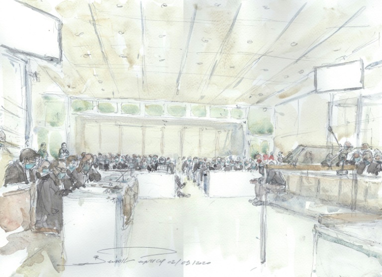 Alors un bref moment, dans la salle d'audience, sourires et rigolades essuient les larmes. Dans leurs box vitrés, tous les accusés ont les yeux braqués sur le grand écran. Certains étouffent même un rire sous leur masque.