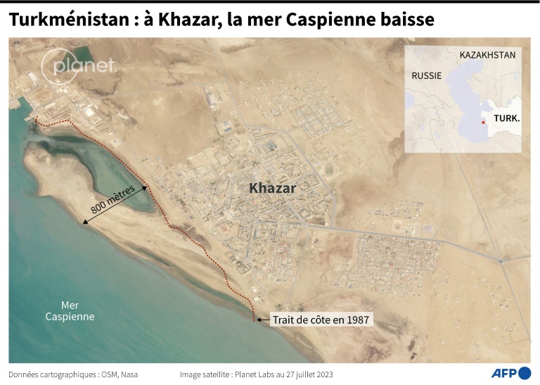 Dans la ville turkmène de Khazar, selon des images satellites, la mer a été repoussée à 800 mètres de la côte. Et au large, une île est même sortie des eaux.