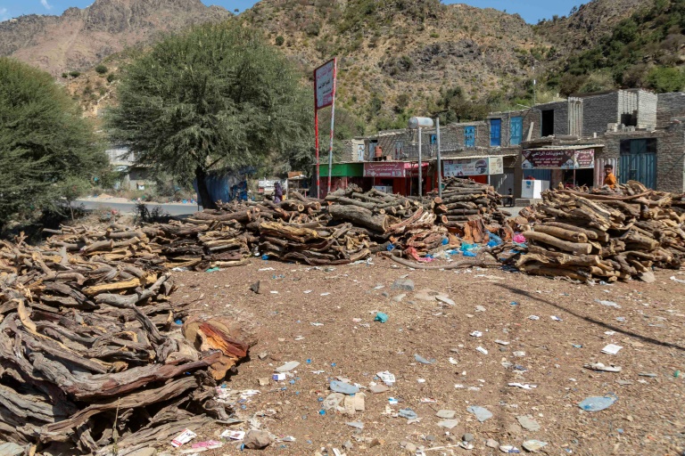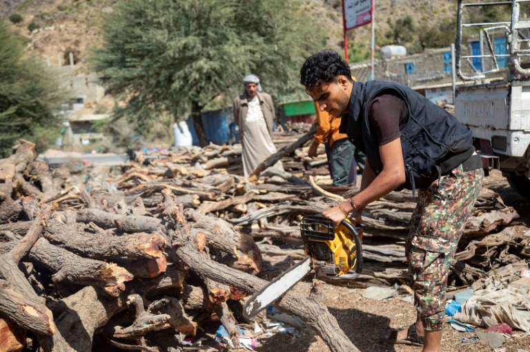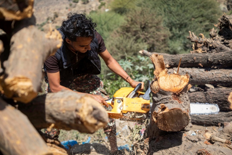 Entre les montagnes du sud du Yémen, le bruit des scies électriques vient déchirer le calme d'un paysage luxuriant, le bois des arbres devenant une source d'énergie alternative pour une population confrontée à l'un des pires drames humanitaires au monde.