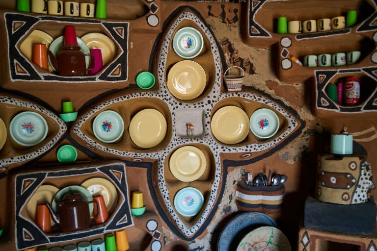 Le soleil rougeoyant caresse les motifs audacieux peints sur sa case ronde au toit de chaume : dans le sud-ouest du Zimbabwe, Peggy Masuku montre aux visiteurs ses mélanges de pigments de terre, de charbon et de cendre qui servent à créer les tons mats de ses œuvres géométriques.
