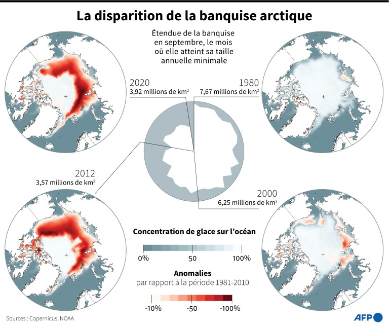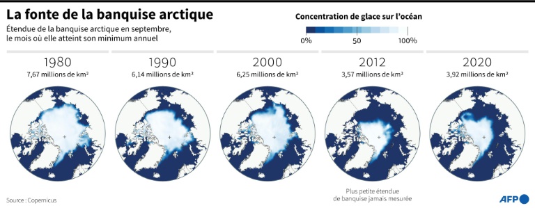 Comparé aux années 1980, la surface de la banquise dans l'Arctique russe est suivant les années de "cinq à sept fois moindre", note l'institut météorologique Rosguidromet dans son rapport du mois de mars, et en 2020, "la couverture de glace en septembre a atteint un record de faiblesse avec 26.000 km2".