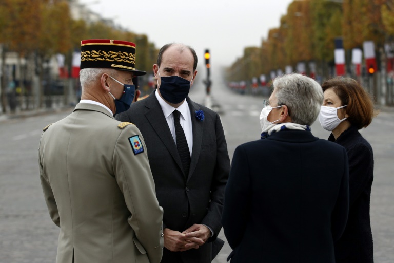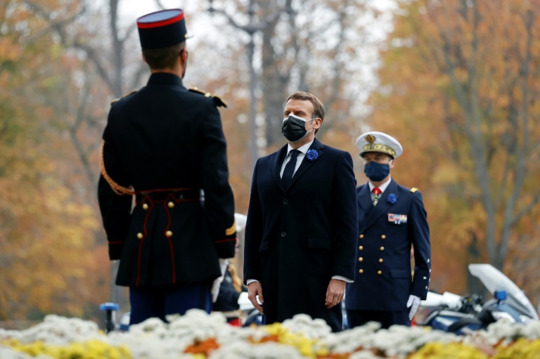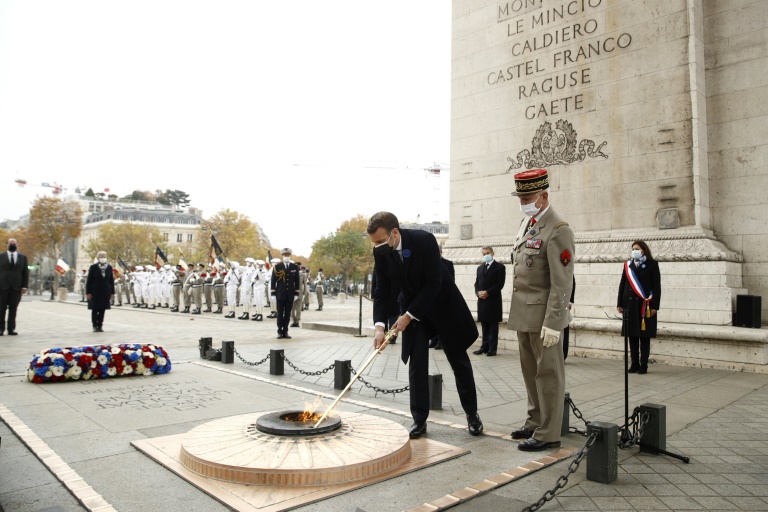 Confinement oblige, la première cérémonie de cette journée mémorielle s'est déroulée en petit comité à 11H00, avec la commémoration du 102e anniversaire de l?Armistice de 1918, qui est aussi le centenaire de l?inhumation du Soldat inconnu sous l?Arc de Triomphe. Le président de la République y a été accueilli par le Premier ministre Jean Castex, le chef d'état-major des armées, le général François Lecointre, la ministre des Armées Florence Parly et la ministre déléguée Geneviève Darrieussecq.
