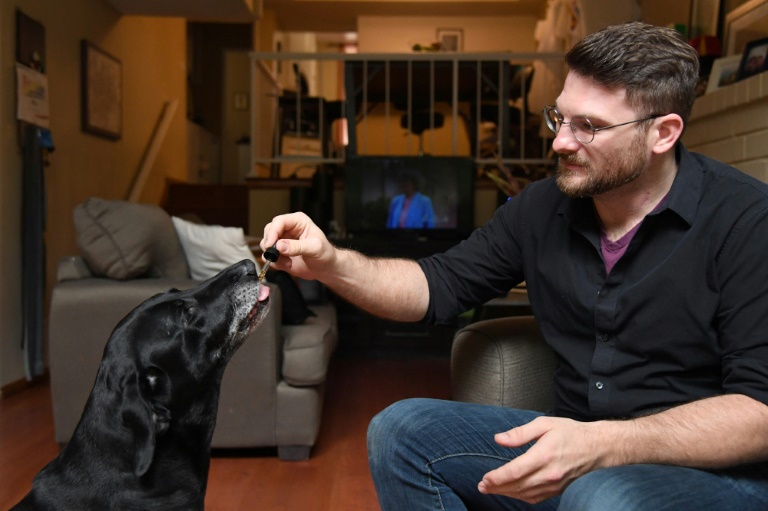 "Depuis que j'ai commencé à lui donner du CBD (cannabidiol, un extrait de marijuana), son angoisse de séparation a disparu", affirme M. Hartmann, 30 ans, à propos de sa chienne, acquise lorsqu'il était étudiant pour l'aider lors de ses crises d'épilepsie. Ce consultant dans le domaine de la marijuana près de Los Angeles assure que le cannabis l'a aidé à soigner son épilepsie et qu'il n'a plus besoin que sa chienne l'accompagne partout.