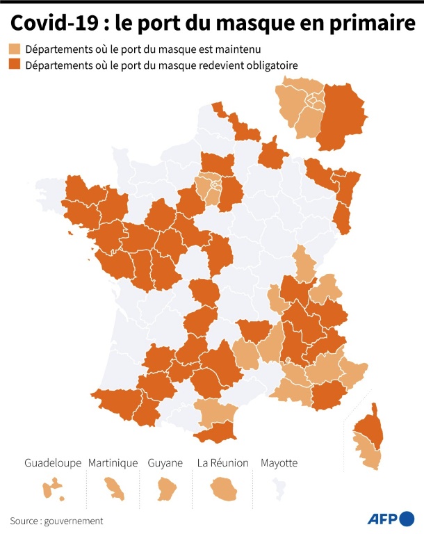 Pour le retour des vacances de la Toussaint, les élèves du CP au CM2 ont remis le masque lundi dans 39 départements métropolitains où ils l'avaient enlevé, ainsi qu'à La Réunion, une décision gouvernementale justifiée par la recrudescence de l'épidémie de Covid-19 mais qui suscite des déceptions.