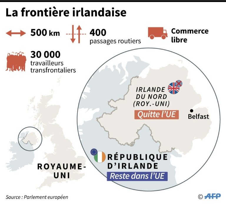 Un accord préliminaire entre Londres et Bruxelles, conclu en décembre 2017, exclut tout rétablissement d'une frontière physique sur l'île d'Irlande.