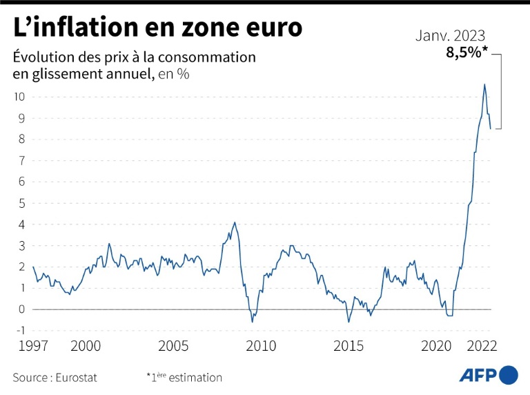 A Francfort, la discussion au Conseil des gouverneurs sera pimentée par l'annonce du nouveau recul en janvier, à 8,5%, du taux d'inflation annuel en zone euro, davantage qu'anticipé par les économistes grâce au recul des prix de l'énergie.
