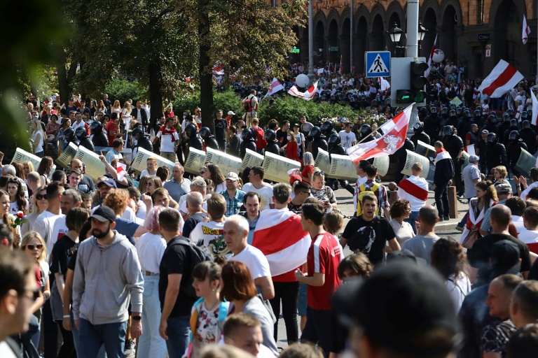 Mais elles n'ont pas fait usage de gaz lacrymogènes, de grenades assourdissantes ou de balles en caoutchouc, comme elles l'avaient fait contre les premiers rassemblements dénonçant la réélection le 9 août de l'homme fort du pays, qui est confronté depuis à une vague de contestation inédite.