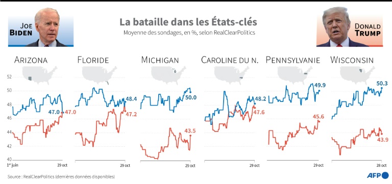 Le candidat démocrate à la Maison Blanche Joe Biden donne vendredi, à quatre jours du scrutin, un net coup d'accélérateur à sa campagne, avec trois étapes dans le Midwest, où se rend également Donald Trump en espérant y rééditer ses bons scores surprises de 2016.