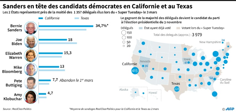 Cette "super" journée électorale, lors de laquelle 14 Etats sont invités à voter pour choisir le rival de Donald Trump en novembre, marque aussi l'entrée en lice d'un nouveau protagoniste: le milliardaire Michael Bloomberg, qui avait renoncé aux quatre premiers scrutins pour cause de candidature tardive.