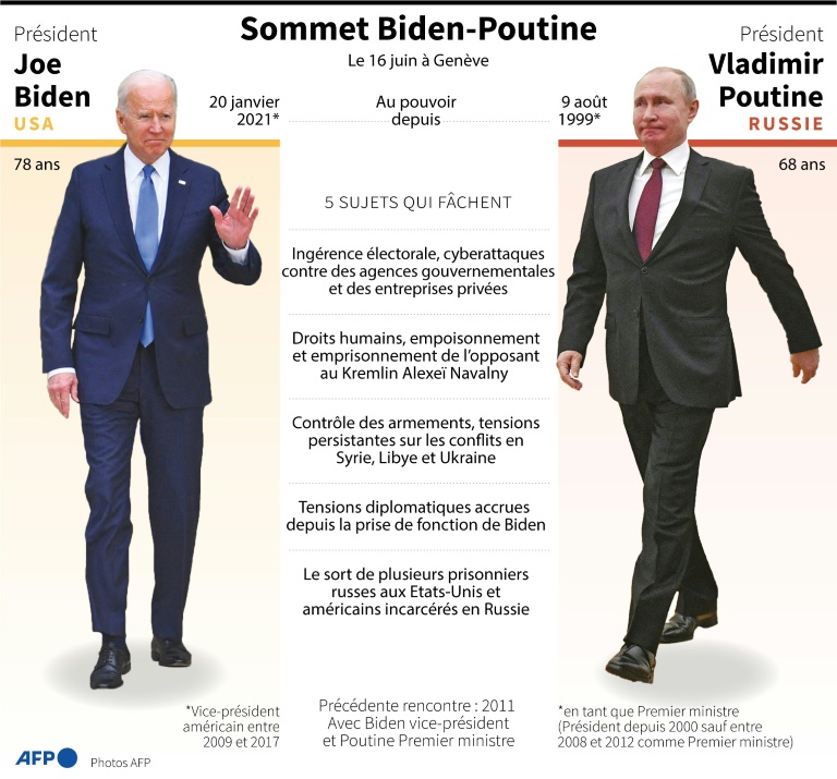 Fort du soutien appuyé des alliés des Etats-Unis, Joe Biden rencontre mercredi Vladimir Poutine lors d'un sommet à Genève destiné à apaiser les tensions avec la Russie et tenter de dégager quelques rares terrains d'entente.