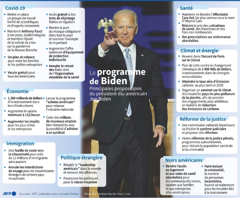 Résolument tourné vers la transition, l'ancien vice-président de Barack Obama, 77 ans, a mis en ligne un site BuildBackBetter.com et des comptes Twitter pour cette période le séparant de son investiture. Il y annonce ses priorités: outre le combat contre la pandémie et la reconstruction économique, il s'agit de la justice raciale et de la lutte contre le réchauffement climatique.