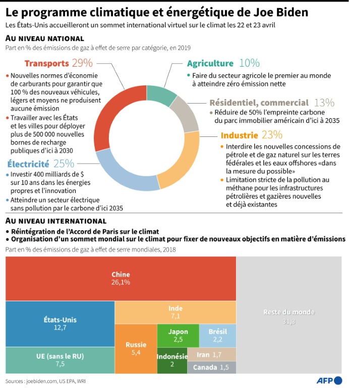A la veille du sommet, un membre de l'équipe Biden a dit "attendre des actes lors de cette réunion", point d'étape vers la grande conférence de l'ONU, la COP26, prévue en fin d'année à Glasgow, en Ecosse. Les grandes puissances invitées, qui représentent ensemble 80% des émissions mondiales, se sont mises en ordre de marche.
